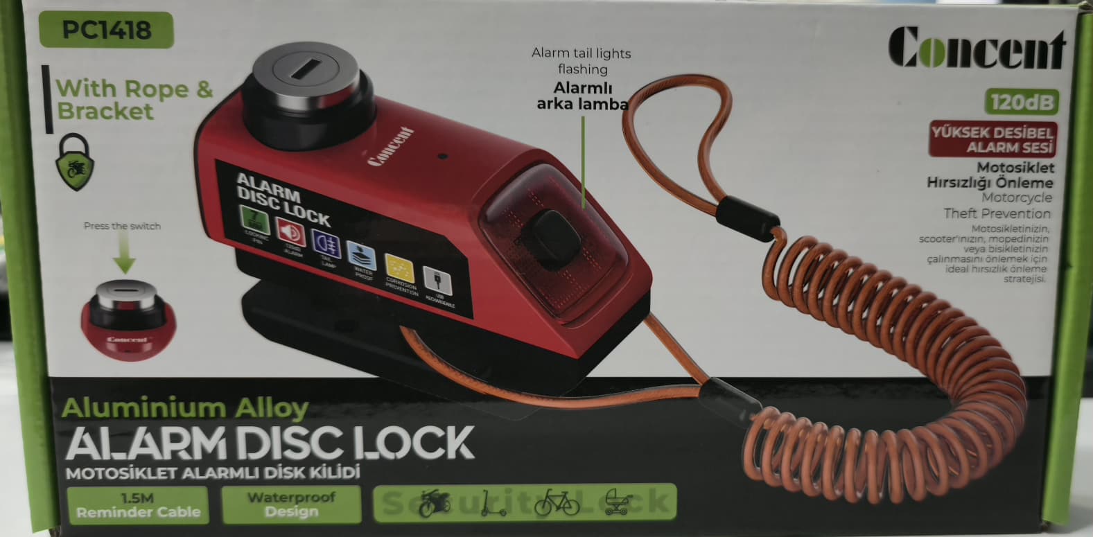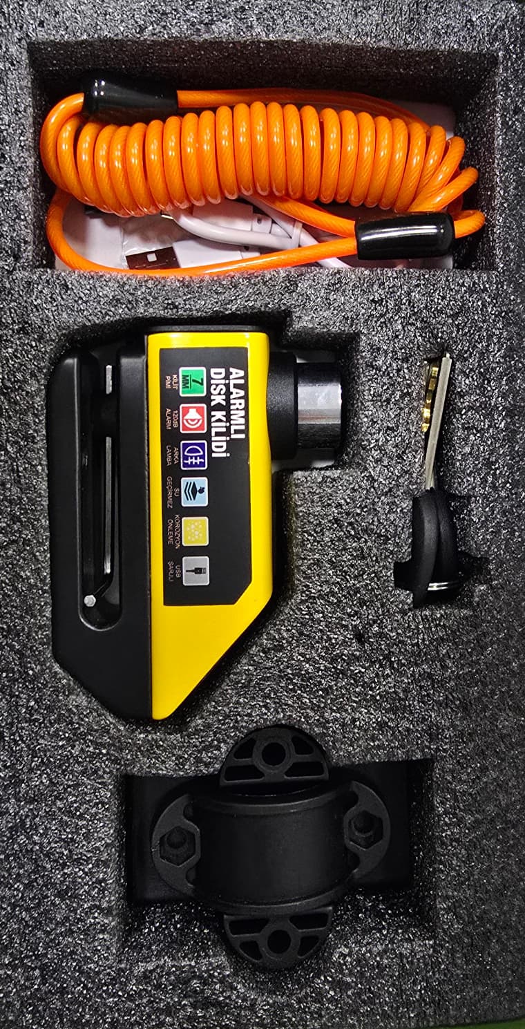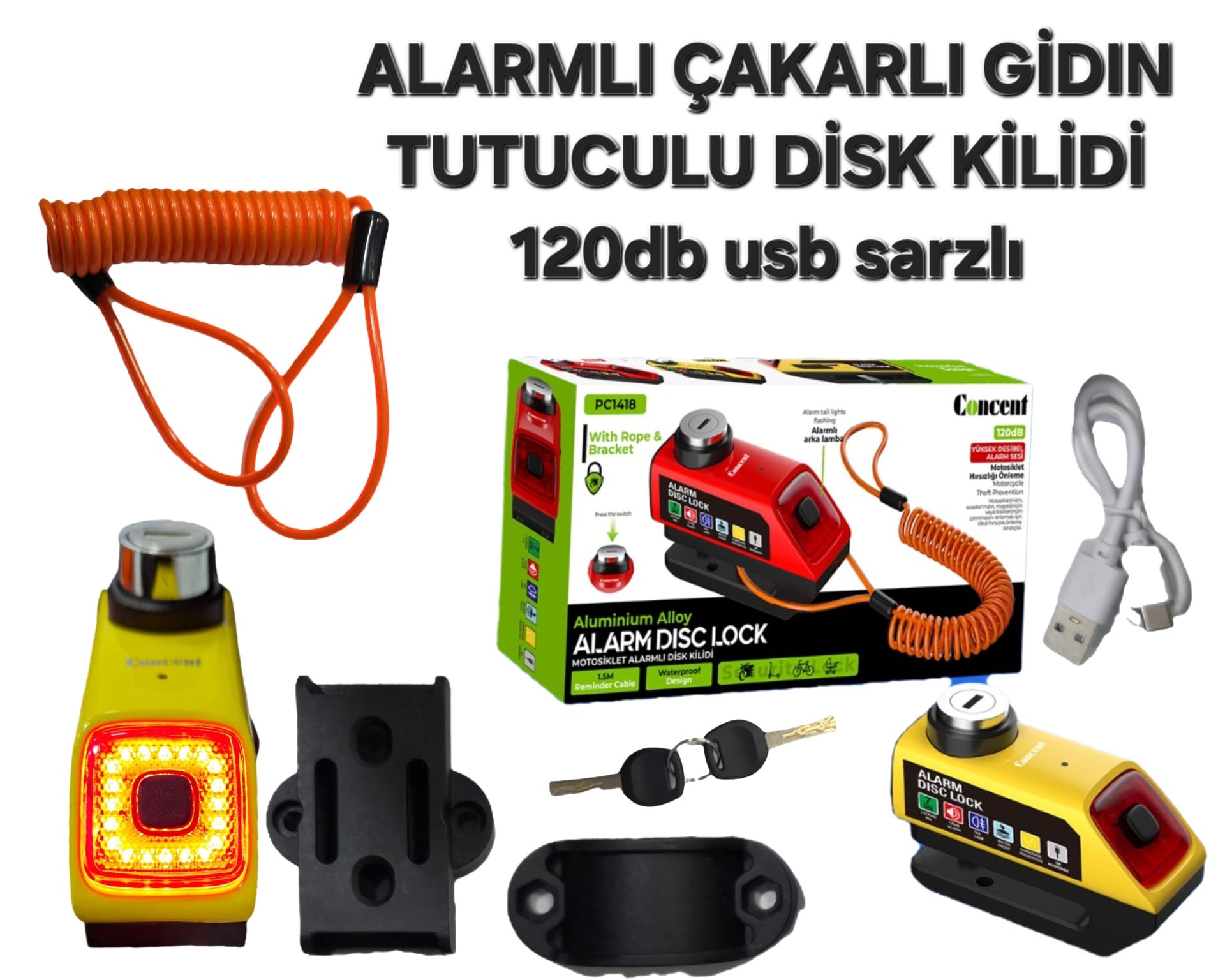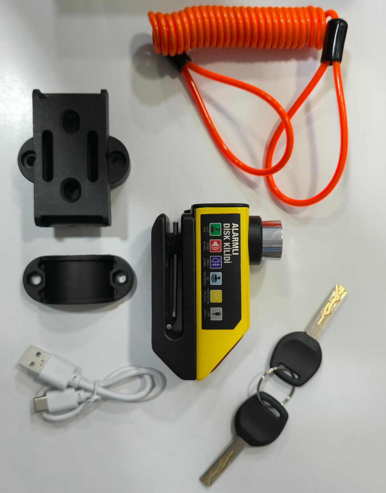 ALARMI SARZLI IŞIKLIDİSK KİLİTİ 120DB SU GEÇİRMEZ 7 KİLİT PİMLİ GİDON TUTACAKLI UYARI İPLİ